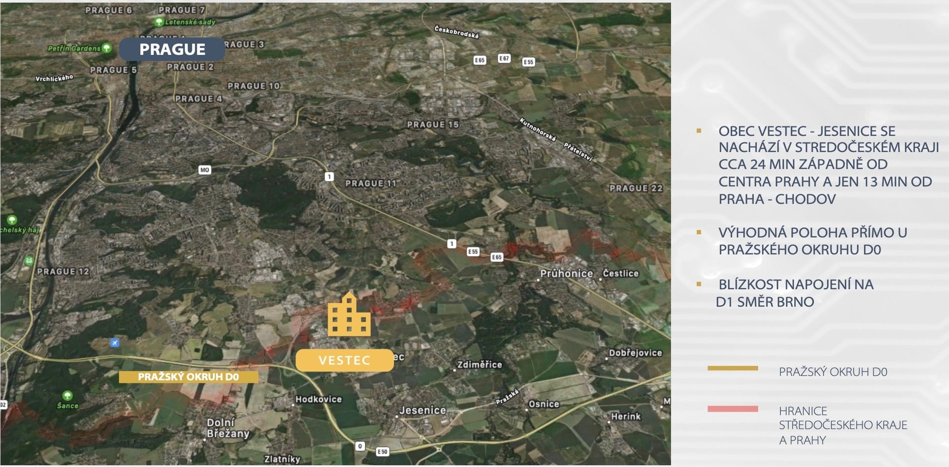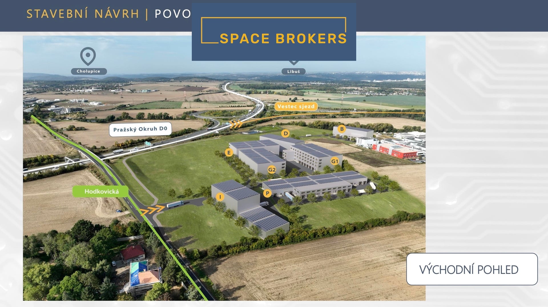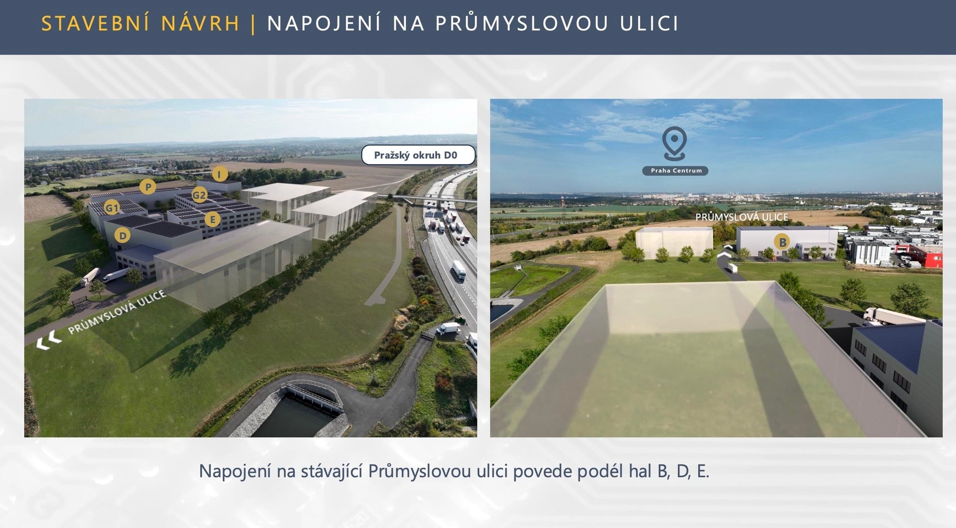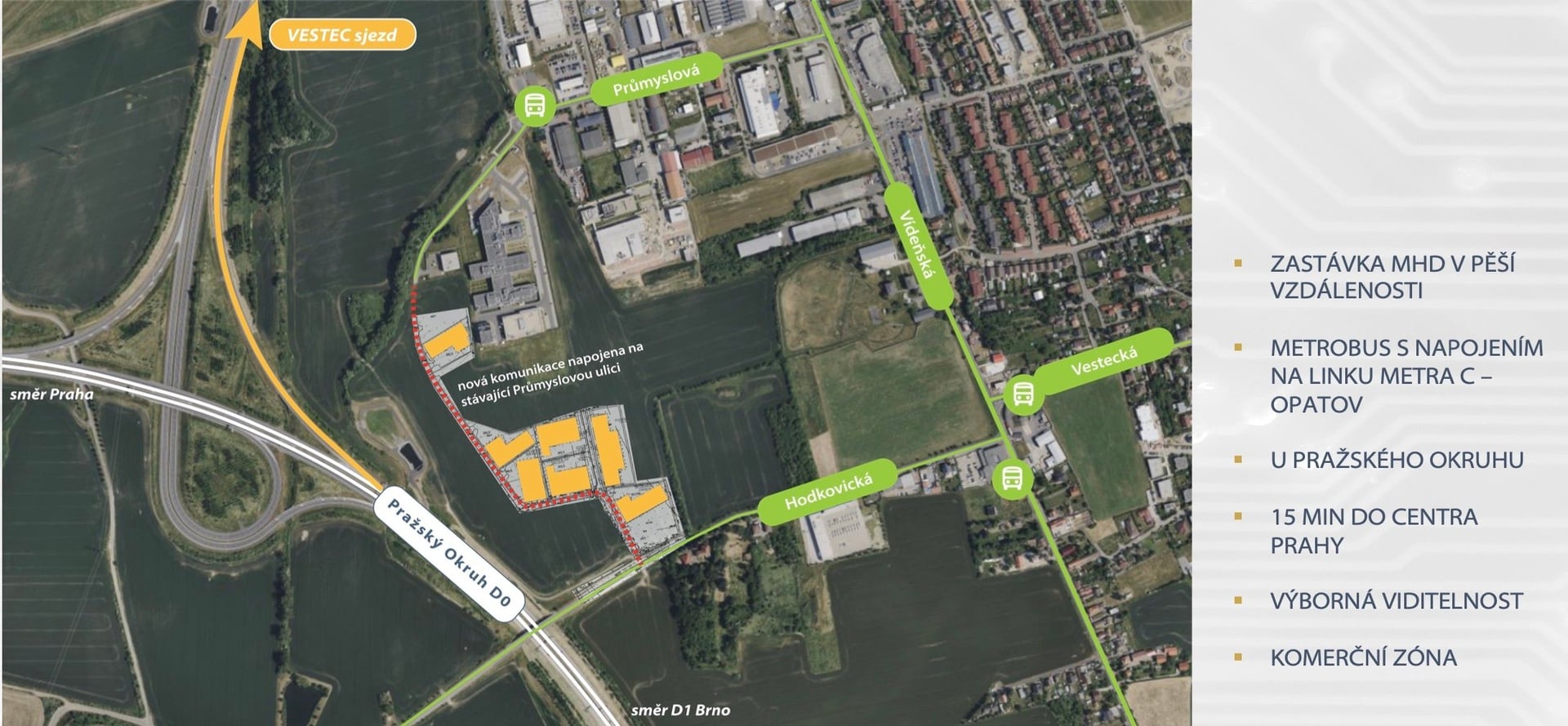 Poloha projektu v těsné blízkosti u D0 zaručuje výbornou dostupnost a bezproblémovou logistiku. Lokalita je tak velmi dobře dostupná nejen osobním ale hlavně nákladními automobily. Povolené výšky staveb poskytnou jak dobrou viditelnost v okolí, tak budoucí flexibilní uspořádání.