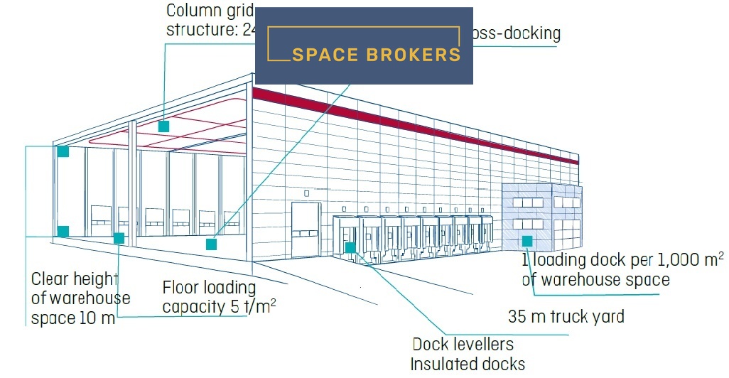 Technické parametry: sprinklery, infrazářiče nebo podstropní sahary, kanceláře dle požadavků, světlá výška 10 m, nosnost podlahy 5 t/m², minimálně jedna nakládací rampa s nakládacím můstkem na 1 000 m² skladové plochy, přímé vjezdy, led osvětlení apod.